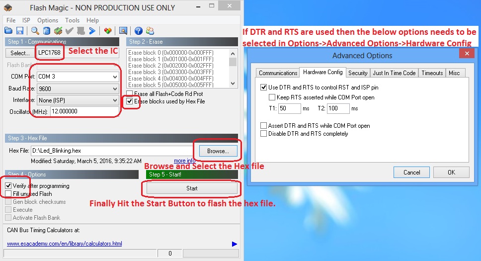 Note: If your converter does not have DTR and RTS lines, "hold down the ISP/PRI_BLD switch, RESET the board(press and release reset switch) and then release the ISP switch ". Now the Boot Contoller will be in ISP/PRI_BLD mode and you can flash the hex file using flash magic.